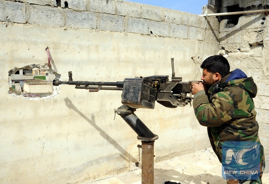 A Syrian soldier stands guard behind his machine gun in the capital Damascus' Eastern Ghouta countryside on March 7, 2018. (Xinhua/Ammar Safarjalani)