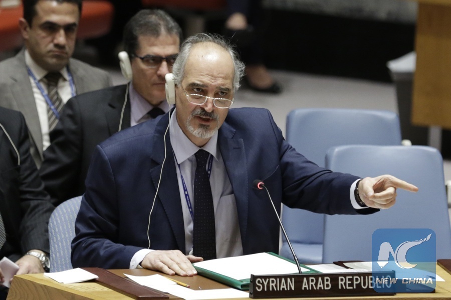 Syrian Ambassador to the United Nations Bashar Ja'afari (Front) speaks after the UN Security Council adopted a resolution demanding a ceasefire across Syria at the UN headquarters in New York, on Feb. 24, 2018. (Xinhua/Li Muzi)
