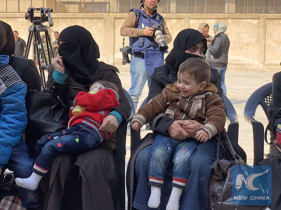 Women and children are among the first major group of Syrian civilians evacuated from the rebel-held areas in the war-torn Eastern Ghouta on the outskirts of Syrian capital Damascus, on March 13, 2018. (Xinhua/Hummam Sheikh Ali)