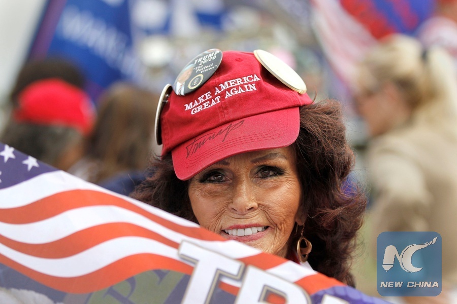 U.S. President Donald Trump's supporters, like Merilyn Cashman of Dana Point, CA, rally near the US-Mexico border for the presidential visit to California to view border wall prototypes in San Diego, California, U.S., March 13, 2018. (Xinhua/REUTERS)