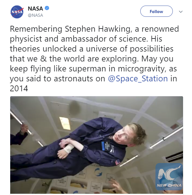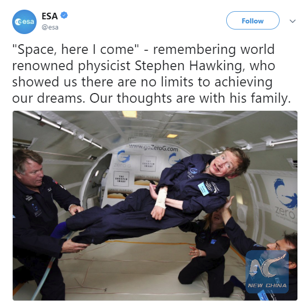 He "showed us there are no limits to achieving our dreams," European Space Agency said in its twitter account, praising the man who suffered amyotrophic lateral sclerosis and lost his ability to write down math equations, but worked with incredible determination to make great accomplishments in cosmology.