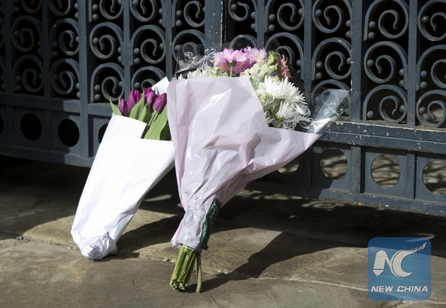 Flowers are seen at the gate of Gonville and Caius College at the University of Cambridge following the death of Professor Stephen Hawking, in Cambridge, Britain, on March 14, 2018. (Xinhua/Isabel Infantes)