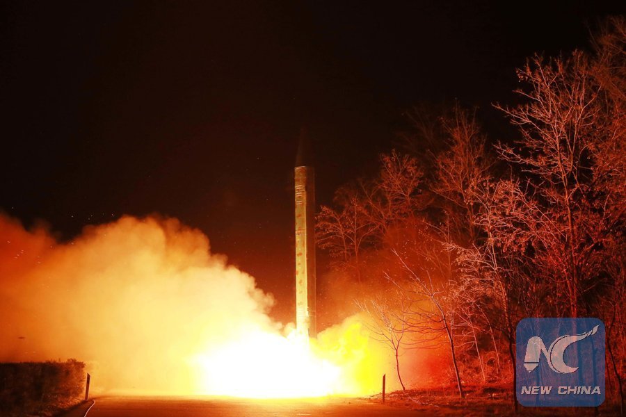 Photo provided by Korean Central News Agency (KCNA) on March 11, 2016 shows a scene of a ballistic rocket launch drill of the Strategic Force of the Korean People's Army (KPA). Top leader of the Democratic People's Republic of Korea (DPRK) Kim Jong Un recently watches a ballistic rocket launch drill of the Strategic Force of the Korean People's Army (KPA) and has ordered the military to get all nuclear weapons ready for action, the official KCNA news agency reported. (Xinhua/KCNA)