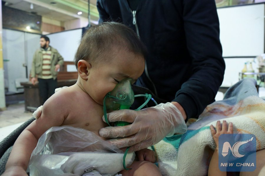 Syrian babies receive treatment for a suspected chemical attack at a makeshift clinic on the rebel-held village of al-Shifuniyah in the Eastern Ghouta region on the outskirts of the capital Damascus late on Feb. 25, 2018. (Xinhua/AFP)