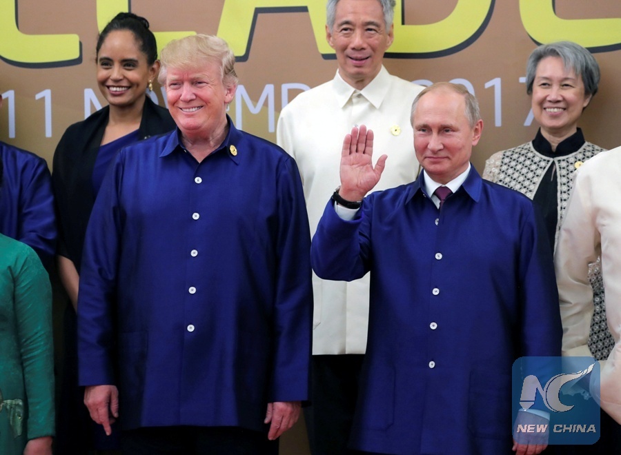 U.S. President Donald Trump and Russian President Vladimir Putin take part in a family photo at the APEC summit in Danang, Vietnam Nov. 10, 2017. (Xinhua/REUTERS)