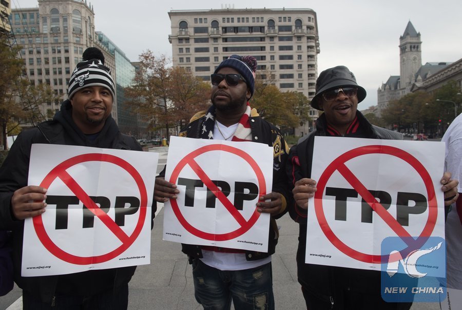 File photo taken on Nov. 14, 2016 shows men holding signs as they demonstrate against the Trans-Pacific Partnership (TPP) trade agreement in Washington, D.C. (Xinhua/AFP)
