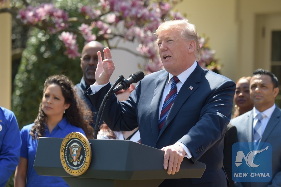U.S. President Donald Trump (front) delivers a speech at the White House, the United States, on April 12, 2018. U.S. President Donald Trump said on Thursday that he was going to hold meeting on Syria and the decisions on the U.S. response to the suspected chemical weapons attack in Syria will be made "fairly soon." (Xinhua/Yang Chenglin)