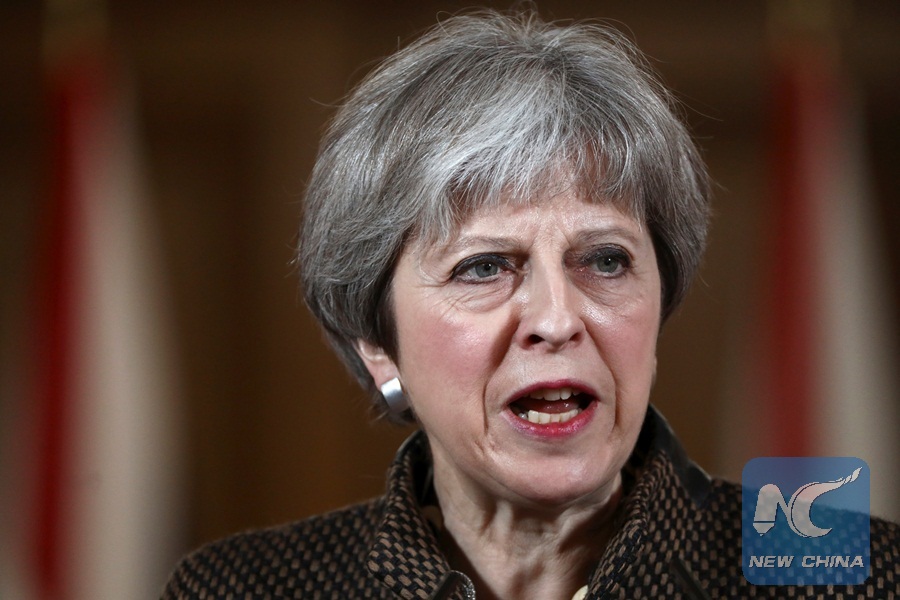 Britain's Prime Minister Theresa May attends a press conference in 10 Downing Street, London, April 14, 2018. (Xinhua/REUTERS)