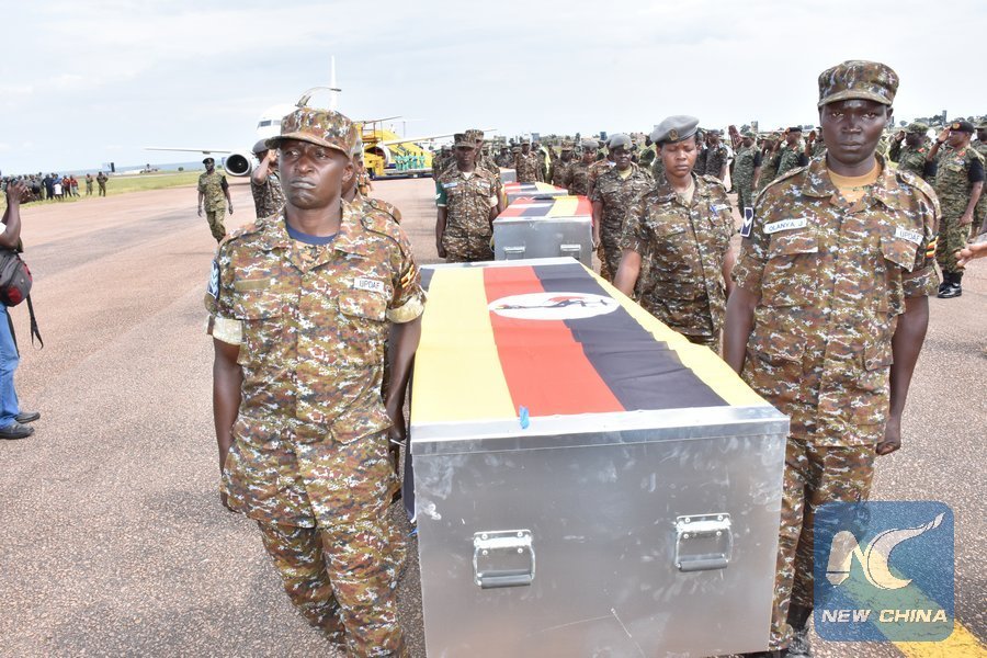 Ugandan army officers carry the caskets bearing the bodies of Ugandan peacekeepers killed in Somalia, at Entebbe military airbase about 40 kilometers south of Kampala, Uganda, Aug. 2, 2017. A plane carrying the bodies of peacekeepers killed in Somalia touched down at Uganda's Entebbe International Airport on Wednesday. Twelve Ugandan peacekeepers were killed and nine others injured by Somali militant group Al-Shabaab on Sunday while on patrol. (Xinhua/Samuel Egadu)