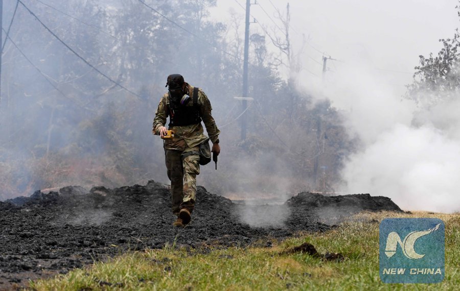 A soldier inspects the "lava zone" in Leilani Estate, Hawaii, U.S., May 9, 2018. According to reports of the Hawaii State government, eruptions of the Kilauea Volcano had forced the evacuation of thousands of people. (Xinhua/Tao Xiyi)