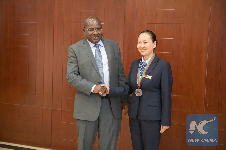 Chitalu Chilufya, Zambia's Minister of Health, awards medal and shakes hands with a member of the Chinese medical team on May 14, 2018. (Xinhua/Peng Lijun)
