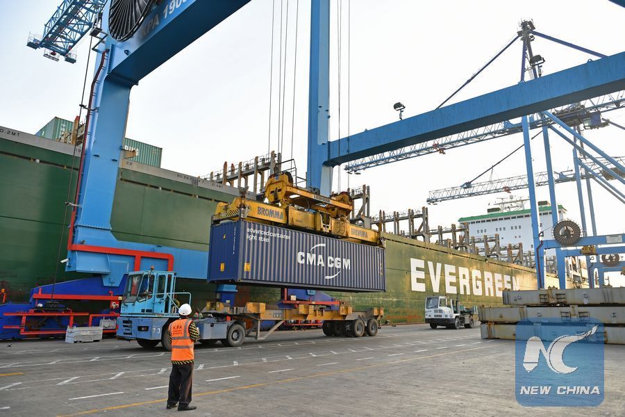 A container is unloaded from a ship at the 19th berth in Mombasa Port, Mombasa, Kenya, Jan. 9, 2017. (Xinhua/Sun Ruibo)