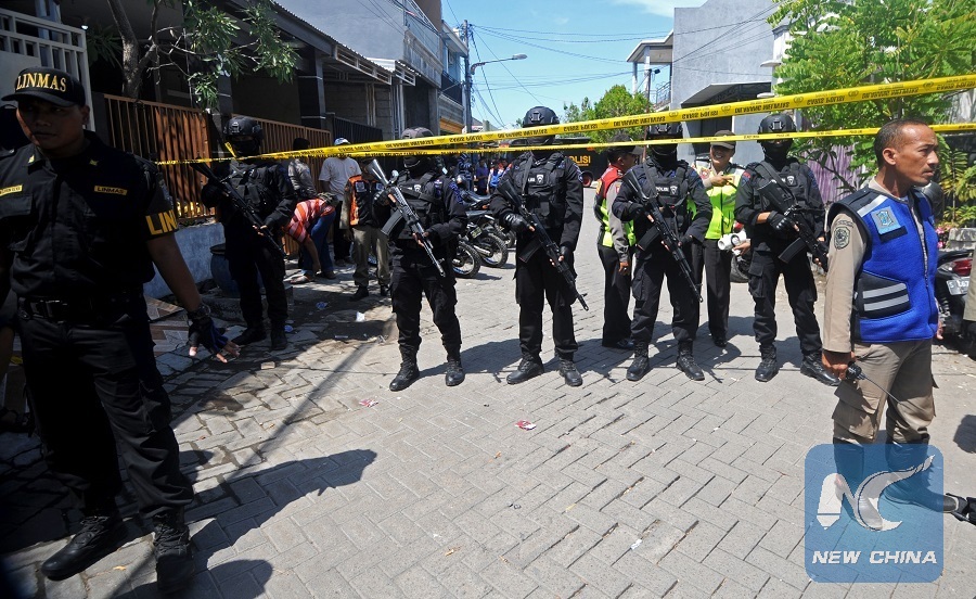 Indonesian police officers secure the area for investigation in the house of family who carried the bomb attack at Surabaya's police headquarters in Surabaya, Indonesia, May 15, 2018. (Xinhua/Agung Kuncahya B.)