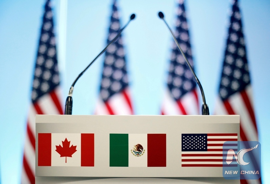 File Photo: The flags of Canada, Mexico and the United States are seen on a lectern before a joint news conference on the closing of the seventh round of NAFTA talks in Mexico City, Mexico, March 5, 2018. (Xinhua/REUTERS)