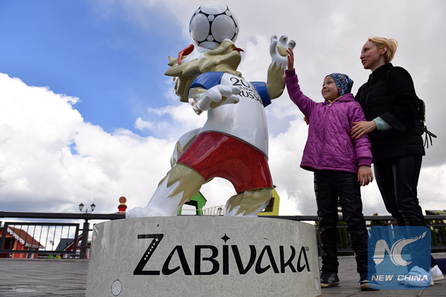 Visitors pose for pictures with a statue of Zabivaka, the official mascot for the 2018 FIFA World Cup, in Kazan on June 10, 2018, ahead of the Russia 2018 World Cup. (AFP photo)