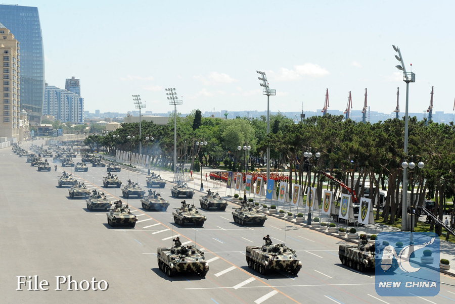 Tanks are seen in a military parade in Baku, Azerbaijan, June 26, 2011. (Xinhua/Liu Yang)