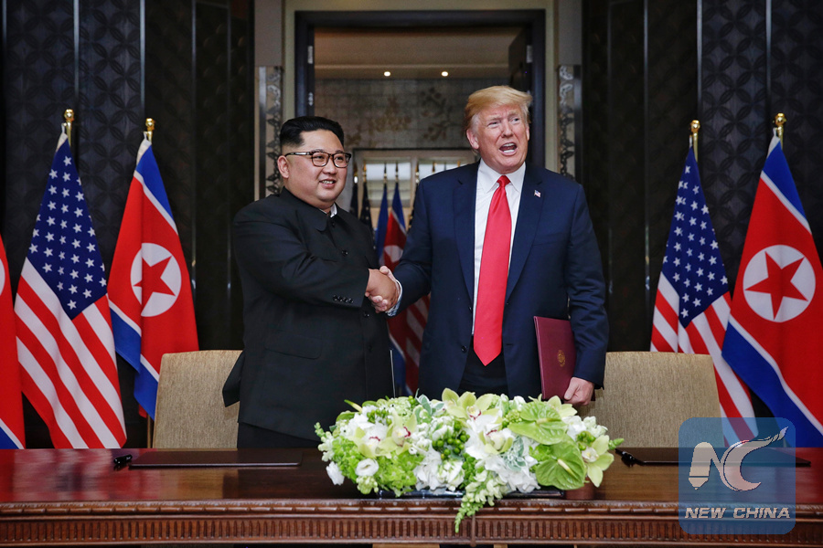 Top leader of the Democratic People's Republic of Korea (DPRK) Kim Jong Un (L) shakes hands with U.S. President Donald Trump during the signing ceremony of a joint statement in Singapore on June 12, 2018. (Xinhua/Ministry of Communication and Information of Singapore)