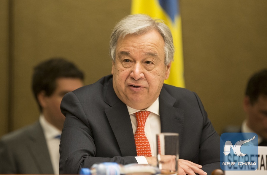 File Photo: UN Secretary-General Antonio Guterres delivers a speech during the High-Level Pledging Event for the Humanitarian Crisis in Yemen at Palais des Nations in Geneva, Switzerland, April 3, 2018. (Xinhua/Xu Jinquan)