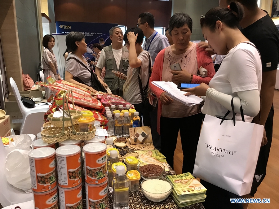 Visitors shop Thai products at the Thai Festival 2018 “Spice up Your Day with Thai Tastes”. The festival was held at the Royal Thai Embassy, Beijing, June 23, 2018. This is the second time that the Thai Festival is organised here as guests can enjoy various activities in the midst of Thai surroundings. (Xinhuanet/Liang Yurou)