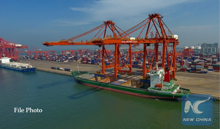Aerial photo taken on June 7, 2018 shows a container dock of Tangshan Port in north China's Hebei Province. (Xinhua/Yao Shiyao)