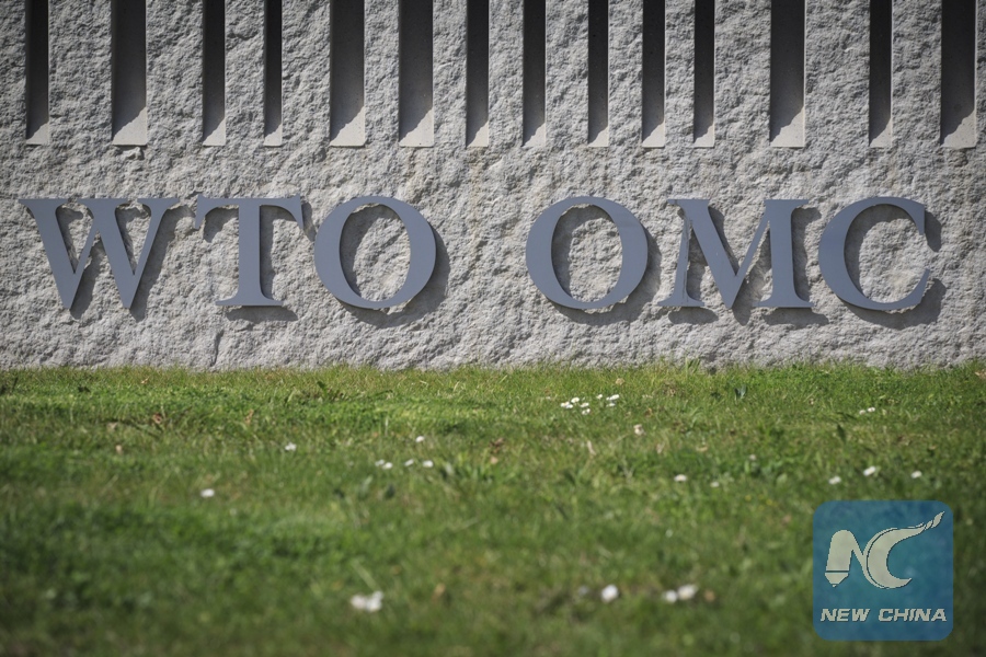 Photo taken on April 12, 2018 shows the abbreviation WTO on the wall of the World Trade Organization headquarters in Geneva, Switzerland. (Xinhua/Xu Jinquan)