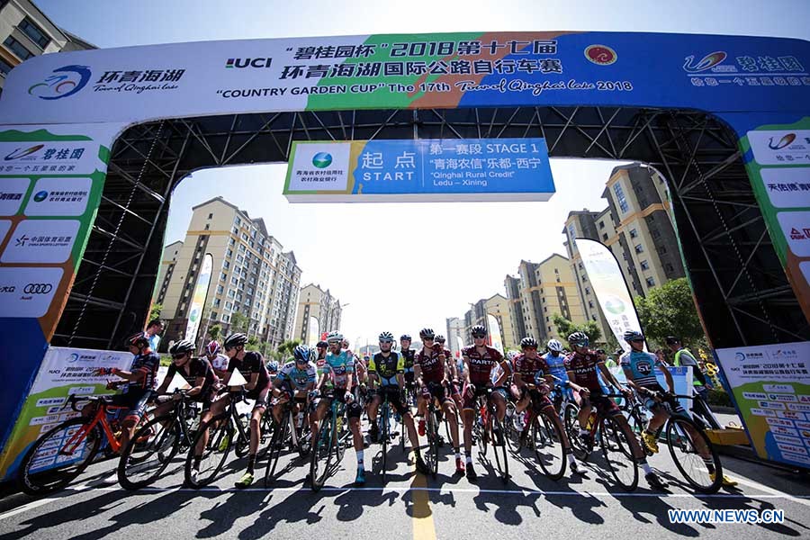 Cyclists wait to start the first stage of the Tour of Qinghai Lake in northwest China's Qinghai Province, on July 22, 2018. (Xinhuanet Photo by Jia Haiyuan)