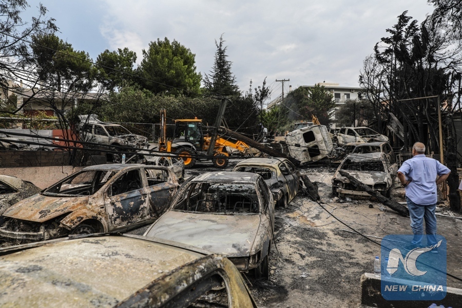 A man looks at burned vehicles in Mati, a seaside town east of Athens, Greece, on July 24, 2018. (Xinhua/Lefteris Partsalis)