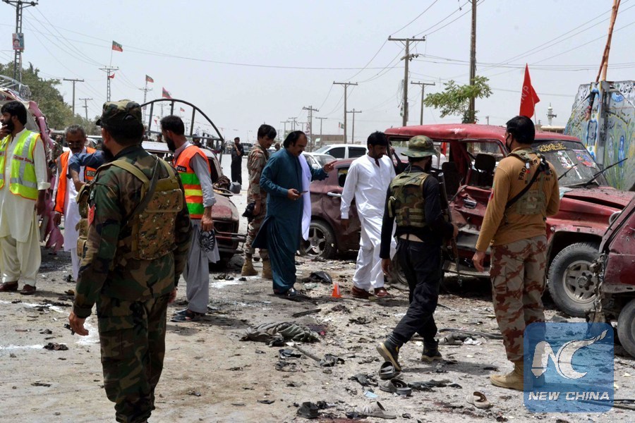 Security officials inspect the blast site in southwest Pakistan's Quetta, on July 25, 2018. (Xinhua/Stringer)