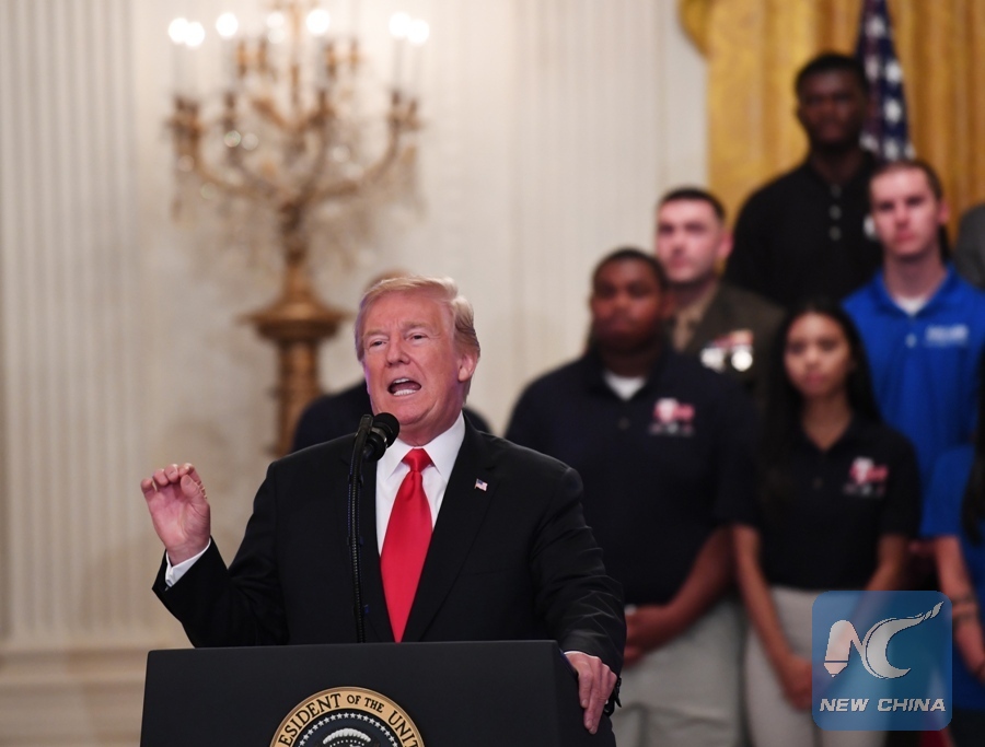 U.S. President Donald Trump speaks during the Pledge to America's Workers event at the White House in Washington, D.C., the United States, on July 19, 2018. (Xinhua/Liu Jie)