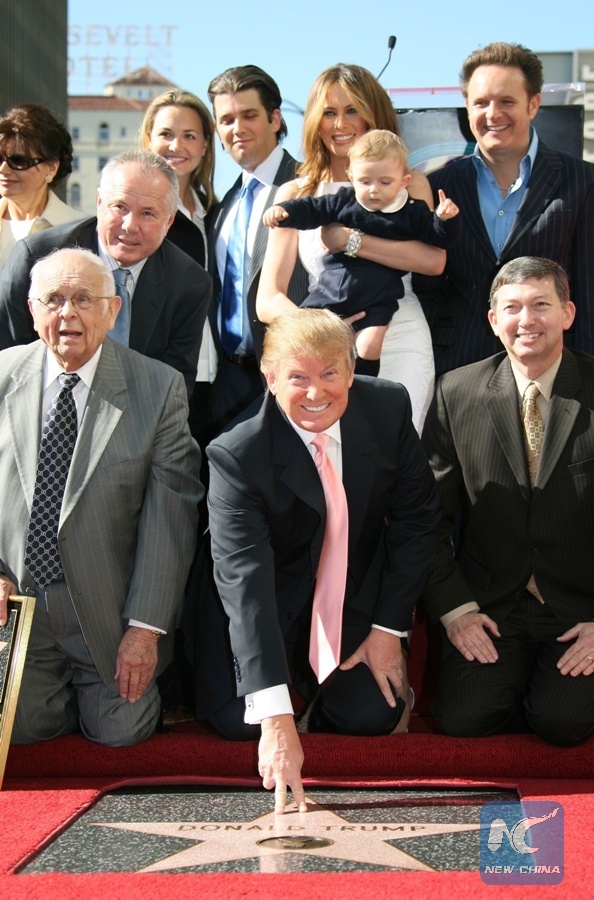 This file photo taken on January 16, 2007 shows US billionaire Donald Trump (C), the producer of NBC's The Apprentice, poses after he was honored by the 2,327th star on the Hollywood Walk of Fame on Hollywood Boulevard in Hollywood, the U.S. state of California. (Xinhua/ AFP PHOTO)