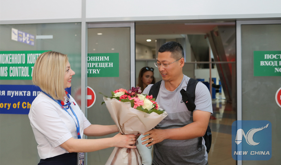 The first Chinese tourist who enjoys the visa-free agreement between China and Belarus receives flowers in Minsk, Belarus, on Aug. 10, 2018. (Xinhua/Wei Zhongjie)