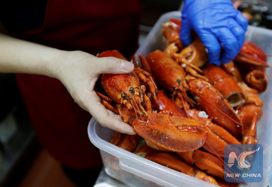 A cook prepares to make the lunch of lobsters imported from Boston, U.S. at the kitchen of a sea food restaurant in Beijing, China July 5, 2018. (Xinhua/REUTERS)