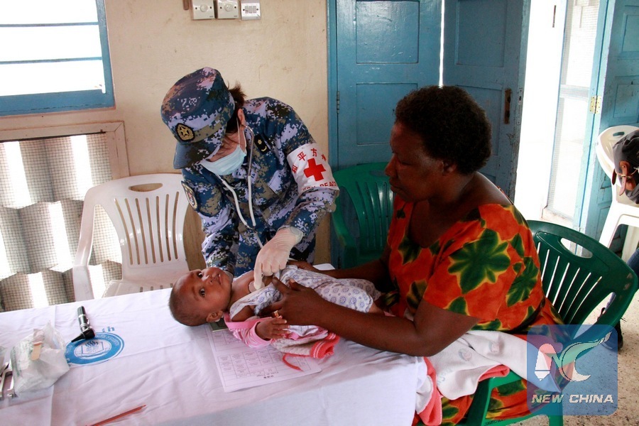 A doctor from the Chinese naval hospital ship Peace Ark examines a child at the Kurasini Children's Home in Dar es Salaam, Tanzania, Nov. 21, 2017. A team of Chinese doctors from the Chinese naval hospital ship Peace Ark on Tuesday visited the Kurasini Children's Home (KCH), a government-owned center established in 1968 to look after abandoned, lost and abused children, where they provided free medical care and donated school bags and toys. (Xinhua/Li Sibo)