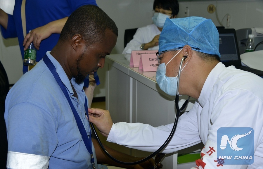 A doctor checks a man's heart in the Chinese hospital ship Peace Ark in Djibouti, on Aug. 24, 2017. The Peace Ark arrived in Djibouti on Wednesday and was expected to carry out a nine-day medical service in Djibouti. It will then travel to Sierra Leone, Gabon, Tanzania and other countries to provide free medical and humanitarian services. (Xinhua/Wang Shoubao)