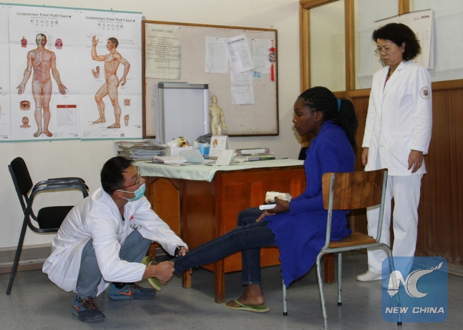 Wang Peng (L), a Chinese doctor checks a girl's injury at the Katutura State Hospital in Windhoek, capital of Namibia, July 22, 2015. The 10th Chinese Medical Team to Namibia consists of four doctors and nurses of the Traditional Chinese Medicine from China's Zhejiang Province. They treat about 600 patients monthly free of charge at the Chinese Acupuncture Department of Katutura State Hospital in Namibian capital Windhoek. China sent its first medical team to Namibia in 1996. (Xinhua/Wu Changwei)