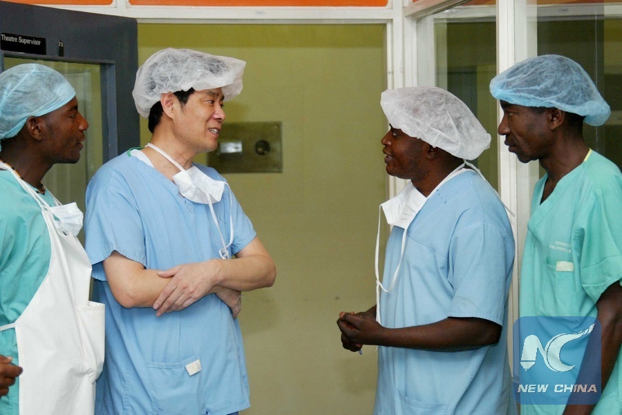 File photo taken on Aug 15, 2007 shows Chinese doctor Wu Weiguo (2nd L) exchanges experiences of surgical anesthesia with local doctors in Lusaka, capital of Zambia. In 1963, China's first foreign aid medical team arrived in Africa. For the past 50 years, Chinese government has sent 23,000 medical personnel to 66 countries and regions, most of which are African countries. (Xinhua/Zhai Xi)