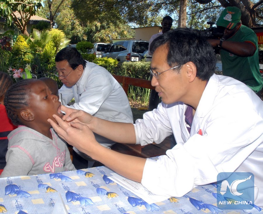 A Chinese doctor takes medical examination of children at a orphanage in Lusaka, capital of Zambia, June 1, 2013. In a move aiming at promoting China-Zambia friendship, three Zambia-based Chinese organizations -- the Confucius Institute, Chinese medical team and Sino-Hydro Zambia Limited on Saturday got together with children of the Kabwata Orphanage in Lusaka during celebrations to mark the International Children's Day. (Xinhua/Kris Moonga)