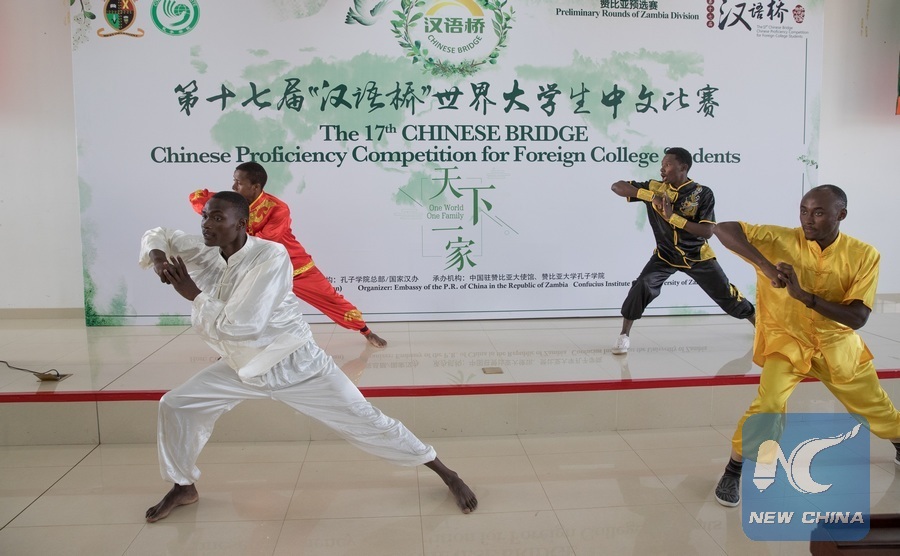 Students from the University of Zambia perform kung fu during the preliminary round competition of "Chinese Bridge" in Lusaka, Zambia, May 28, 2018. The Zambian preliminary round of the 17th "Chinese Bridge" language proficiency competition for university students took place here Monday, with the students showcasing their knowledge of the Chinese language. (Xinhua/Peng Lijun)