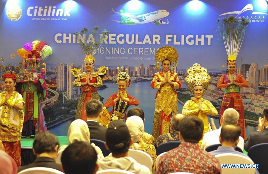 Dancers perform during a signing ceremony between Citilink Indonesia and China's Megacap Aviation Service group in Jakarta, Indonesia, Sept. 7, 2018. Indonesia's low cost carrier Citilink will add three new flight routes to China in October as the number of Chinese traveller visiting Indonesia rises. (Xinhua/Zulkarnain)
