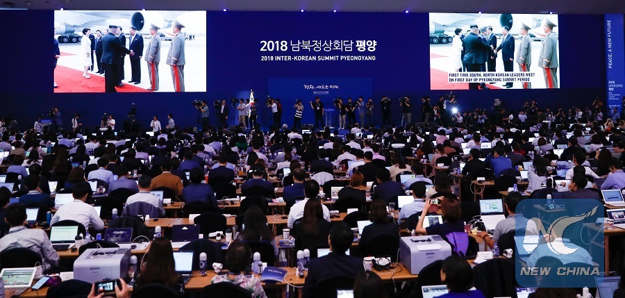 Journalists watch a live broadcast of the arrival of South Korean President Moon Jae-in at Pyongyang International Airport, at the press center for the 2018 Inter-Korean Summit in Seoul, South Korea, on Sept. 18, 2018. (Xinhua/Wang Jingqiang)