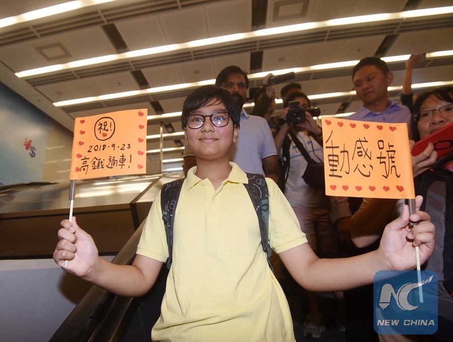 HONG KONG, Sept. 23 (Xinhua) -- "It's so fast!" said Hong Kong resident Leung Shing, as high-speed train G5736 pulled into the Shenzhen North Railway Station in Guangdong Province on the Chinese mainland Sunday morning.