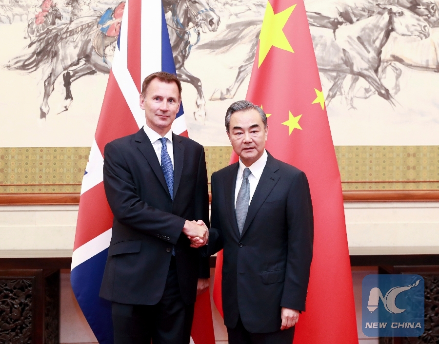 File Photo: Chinese State Councilor and Foreign Minister Wang Yi and British Foreign Secretary Jeremy Hunt co-chair the Ninth China-UK Strategic Dialogue in Beijing, capital of China, July 30, 2018. (Xinhua/Ding Haitao)