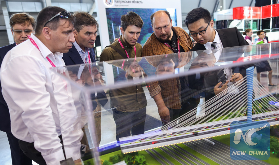 People look at the exhibit during the Russia-China Expo in Yekaterinburg, Russia, on July 9, 2018.(Xinhua/Evgeny Sinitsyn)