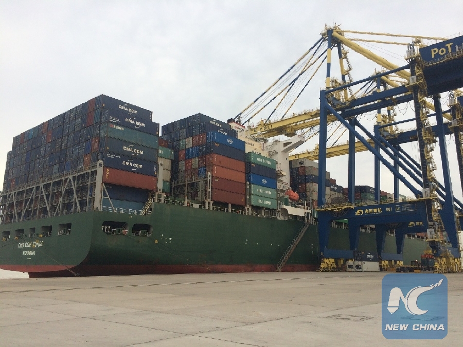 A CMA CGM container ship unloads cargo at Lebanon's port of Tripoli, which opens a new shipping line with China on Oct. 9. (Xinhua/Khalid)