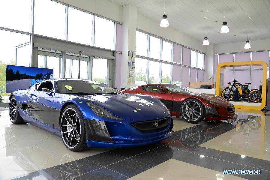 Photo taken on Sept. 11, 2017 shows models of Concept One, electric hypercars manufactured by Rimac Automobili in Sveta Nedelja, a town near Croatian capital Zagreb. (Xinhua/Gao Lei)