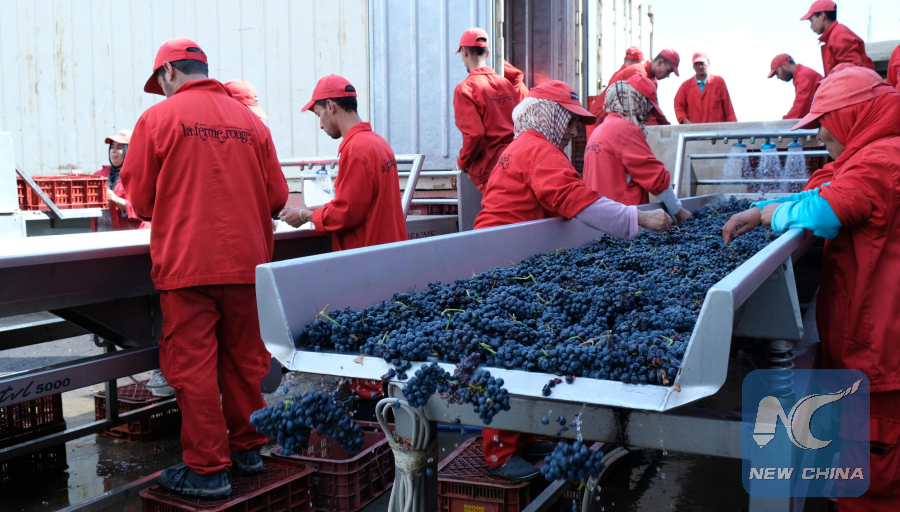 Employees at Red Farm winery pick up grapes in Morocco's western town of Rommani, on Oct. 1, 2018. (Xinhua/Chen Binjie)
