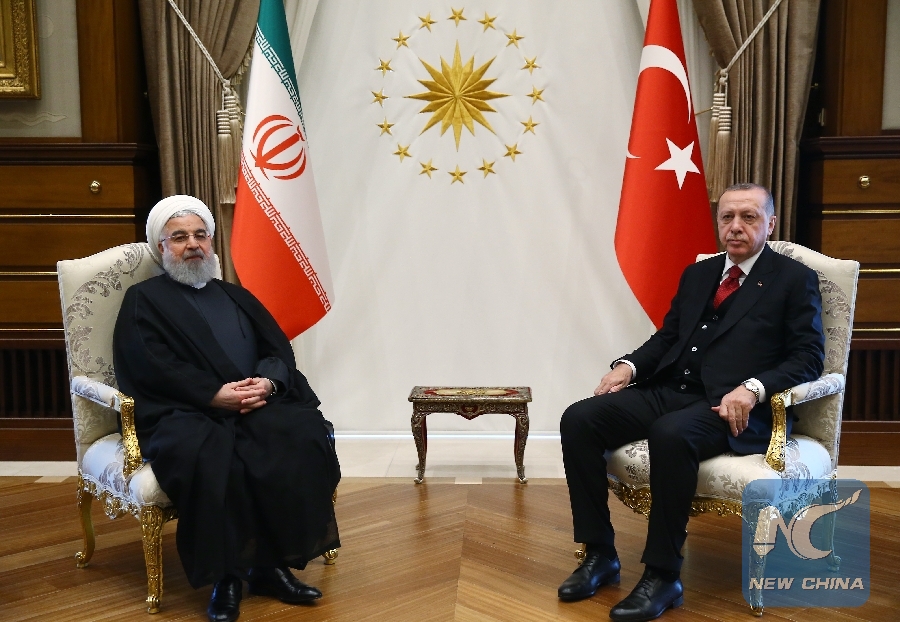 Turkish President Recep Tayyip Erdogan (R) speaks with Iranian President Hassan Rouhani at the Presidential Palace in Ankara, Turkey, on April 4, 2018. (Xinhua/Turkish Presidential Palace)