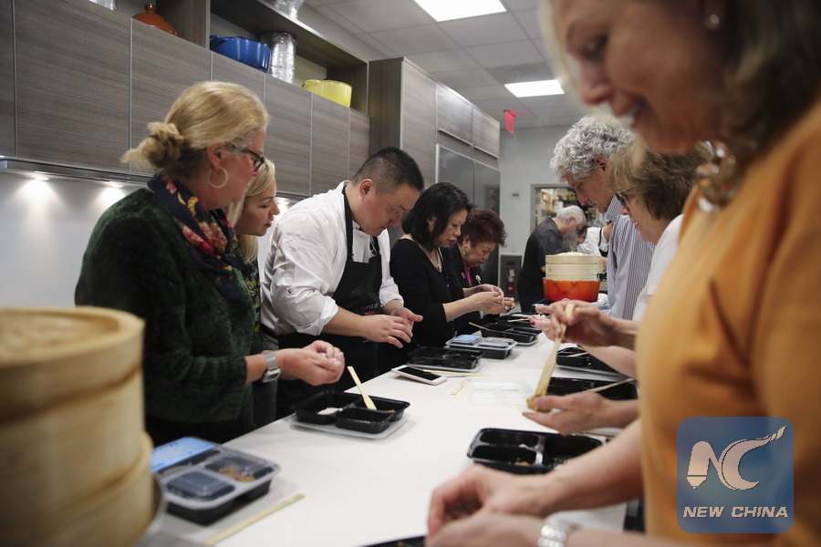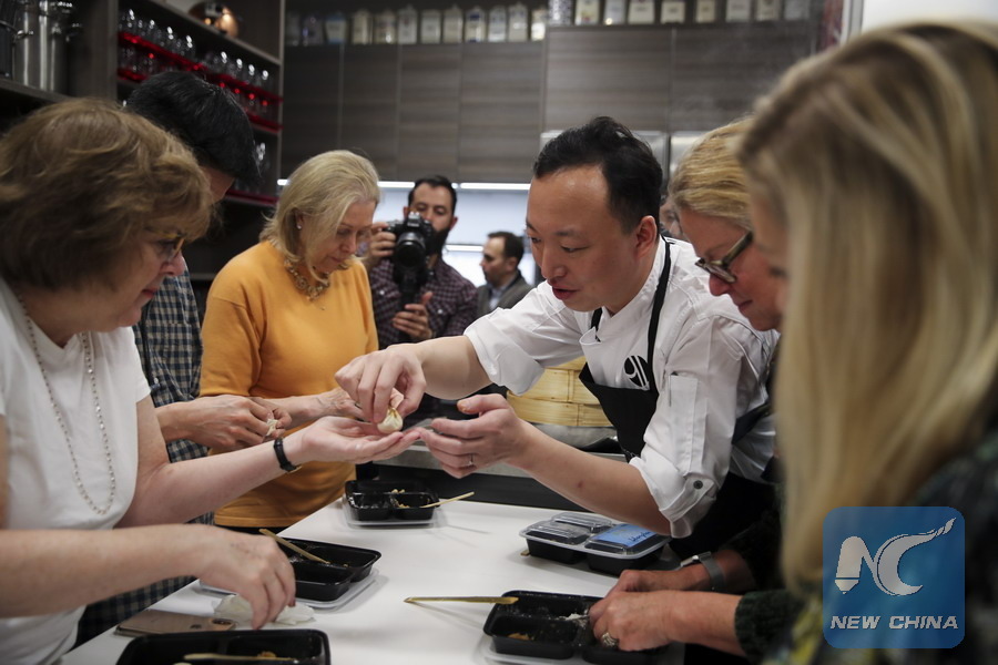 Participants learn to make Xiaolongbao (or steamed soup dumplings) during the Shanghai Food Festival and Tourism Promotion Macy's flagship store in New York, the United States, Nov. 19, 2018. (Xinhua/Wang Ying)