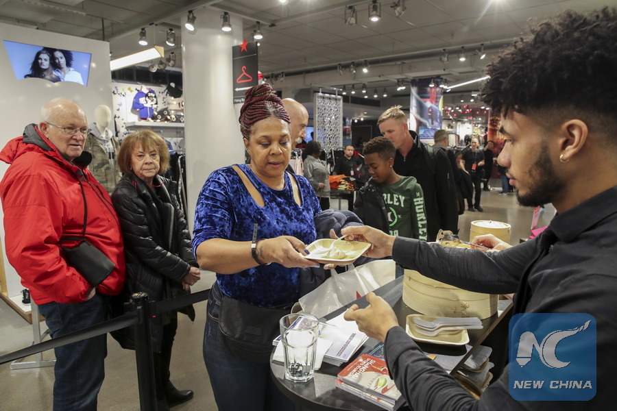 Participants line to taste Xiaolongbao (or steamed soup dumplings) during the Shanghai Food Festival and Tourism Promotion Macy's flagship store in New York, the United States, Nov. 19, 2018.