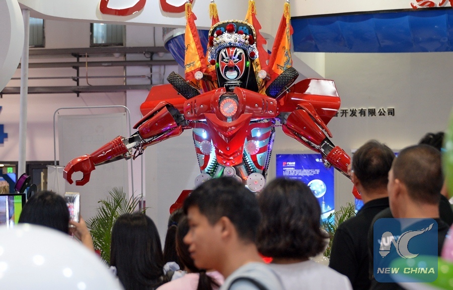 Visitors watch a robot during the World Robot Conference 2017 in Beijing, capital of China, Aug. 23, 2017.(Xinhua/Li Xin)